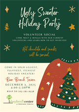 Join us for yummy bites at Vienna VA favorite, Bear Branch Tavern! Mix and mingle with existing SCNOVA volunteers and learn how your special skills can serve as an asset, serving older adults in your community. Wear your favorite holiday inspired “ugly sweater”. 4:00 pm to 5:30 pm at Bear Branch Tavern – 133 Maple Ave. E, Vienna, VA 22180. This is a free event. Please call 703-281-0538 to register with the office.